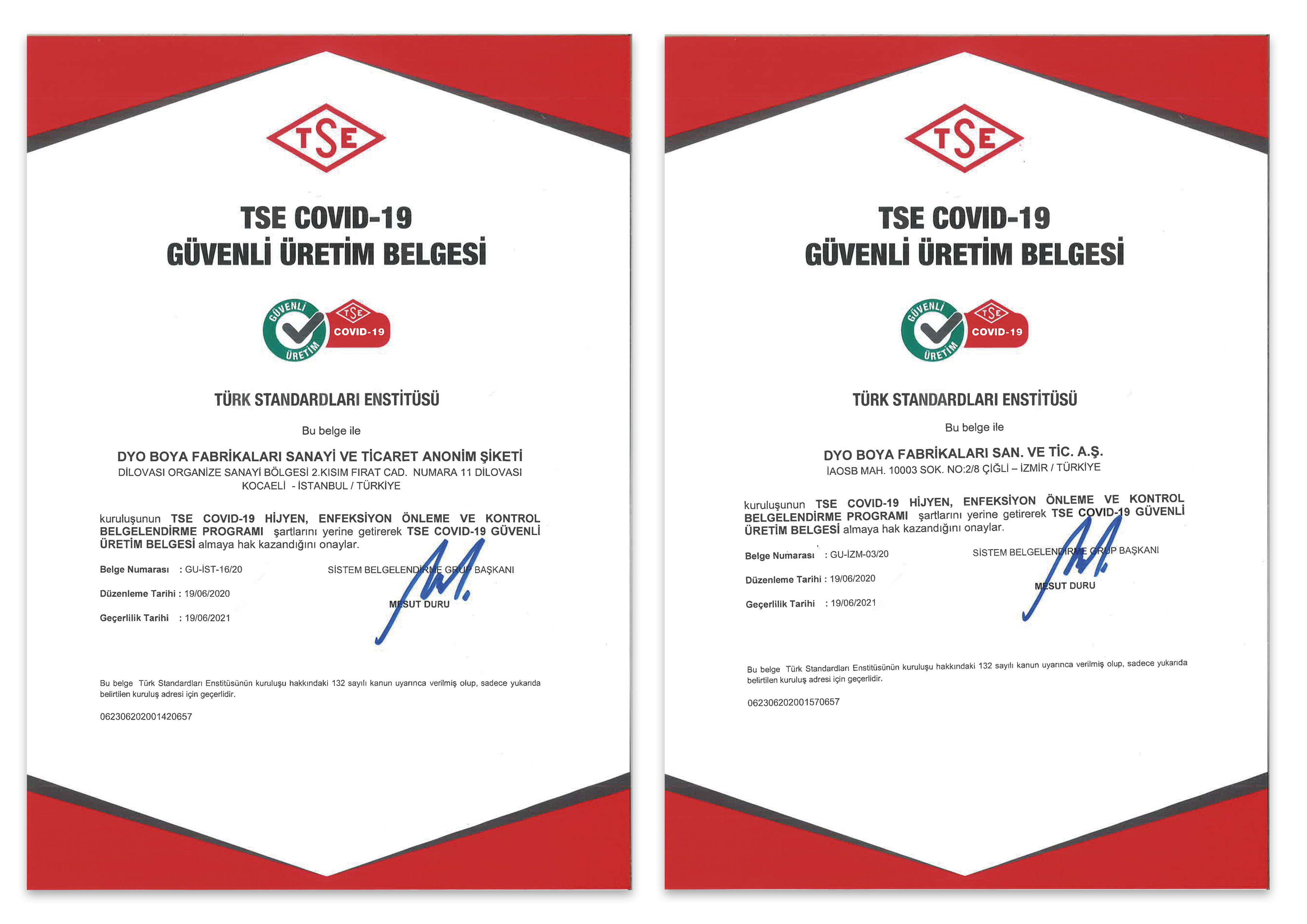 Производственные предприятия компании DYO в Чигли и Диловаси получили “Сертификат безопасного производства TSE Covid-19”. Компания DYO стала первой компанией в лакокрасочной отрасли Турции, получившей этот сертификат.